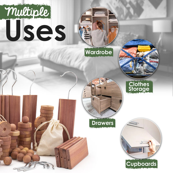 • THE BOUNTIFUL BUNDLE FOR ALL YOUR NEEDS - Our cedar can be placed in drawers, closet shelves, on your hangers and more. As they are 100% natural they can touch any fabric directly and won't stain or emit any smell on clothes. Our cedar blocks for closets also reduce mustiness, absorb excess moisture and keep your wardrobe smelling delectably fresh. Put the cedar balls into the cotton bag sachets provided for the best experience.